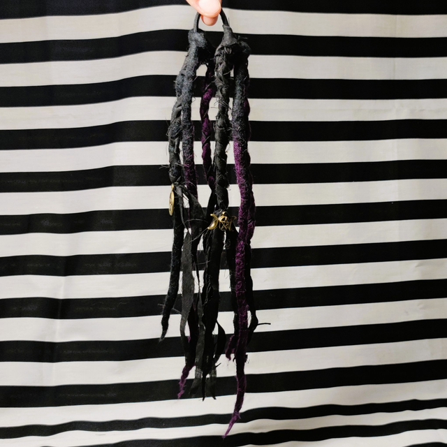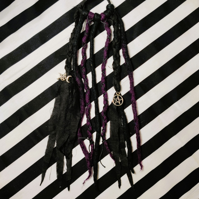 Ein Haargummi wie ein Zauberspruch: DreadMyst vereint gefilzte Dreads aus 100 % Schafwolle in tiefem Schwarz und mystischen Farben. Mit einer Länge von ca. 30 cm fließen die Strähnen wie Schatten durch dein Haar – wild, frei und voller Magie.